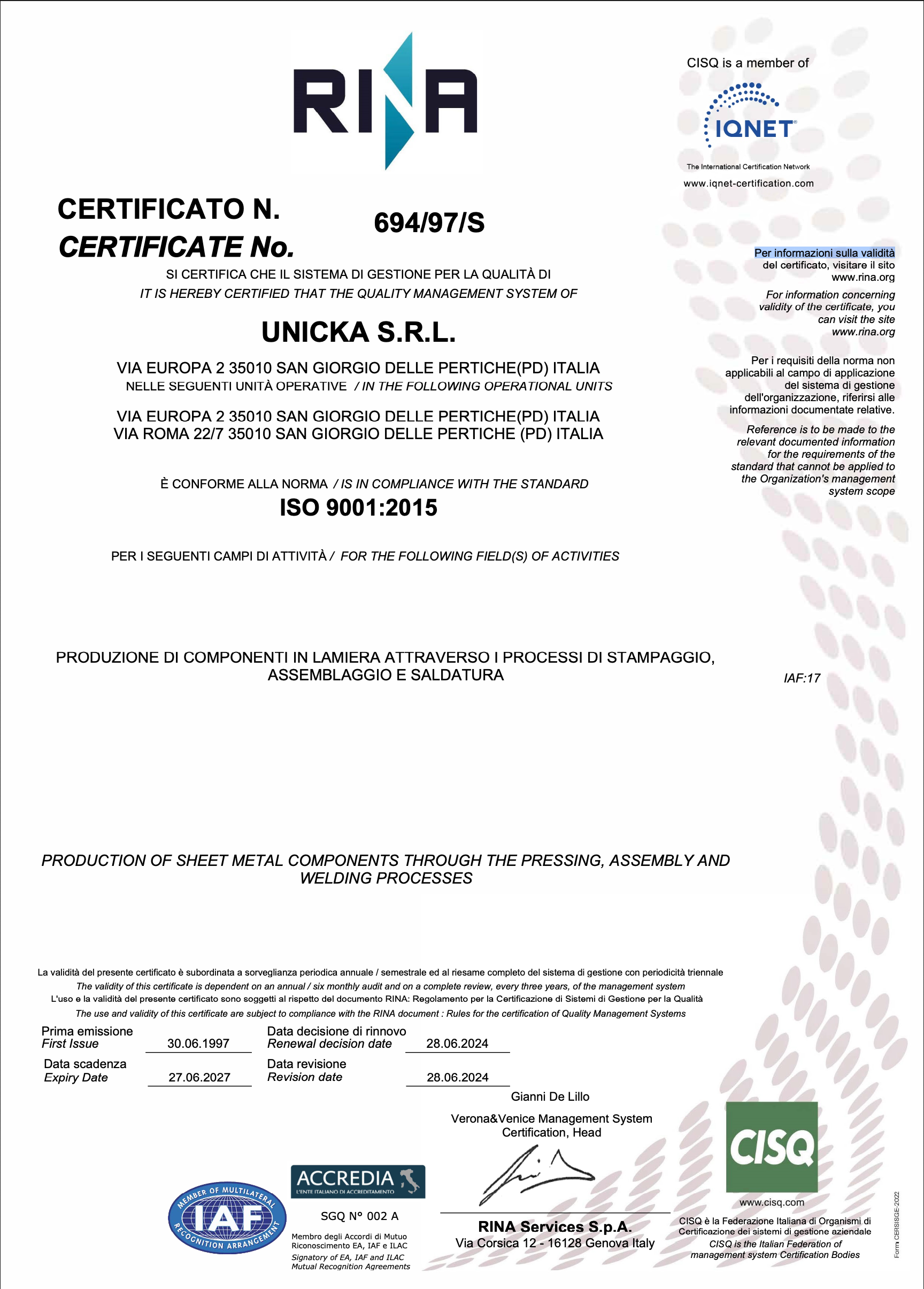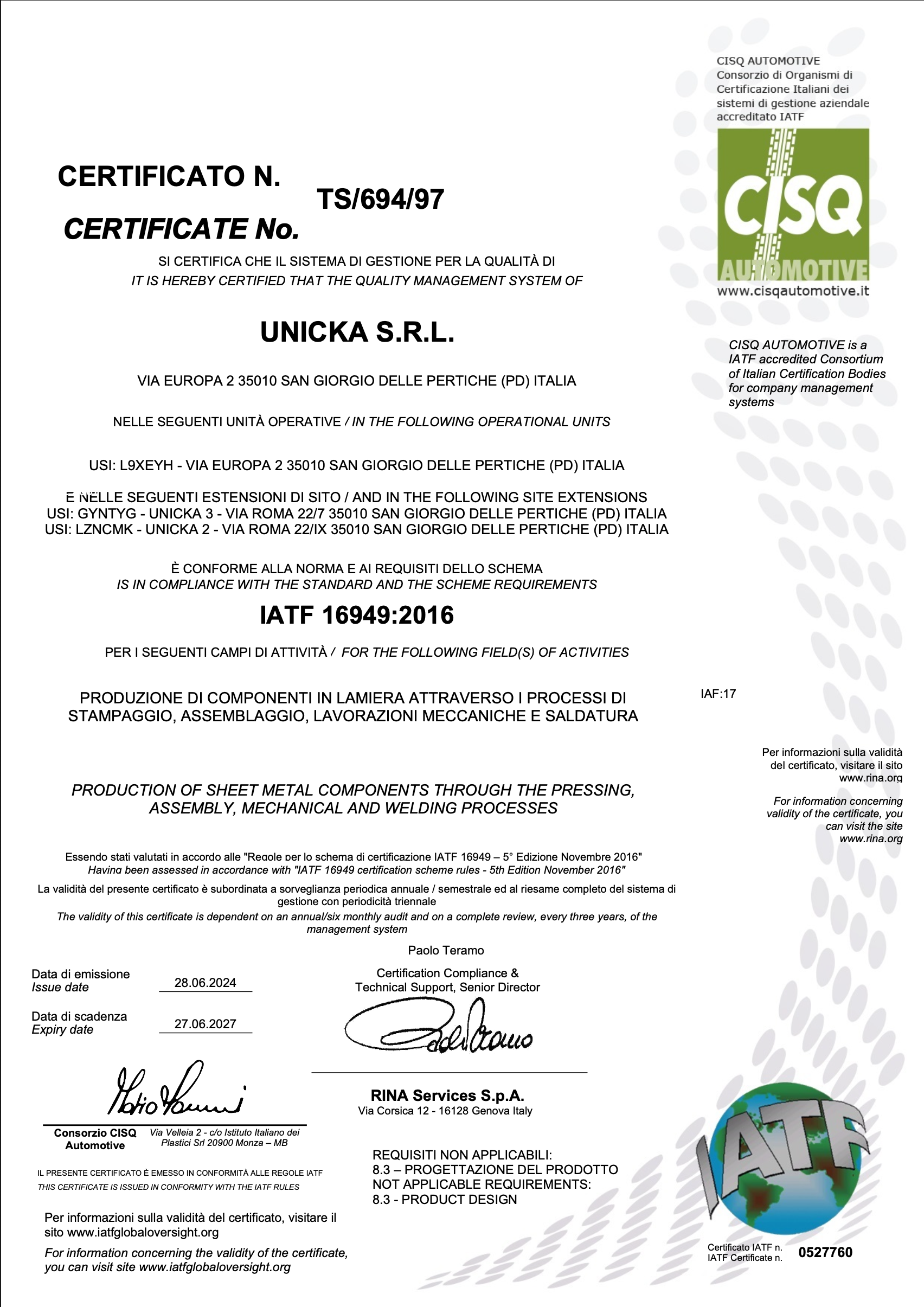 Un’ulteriore dimostrazione che UNICKA è un’azienda moderna, innovativa, qualificata.
