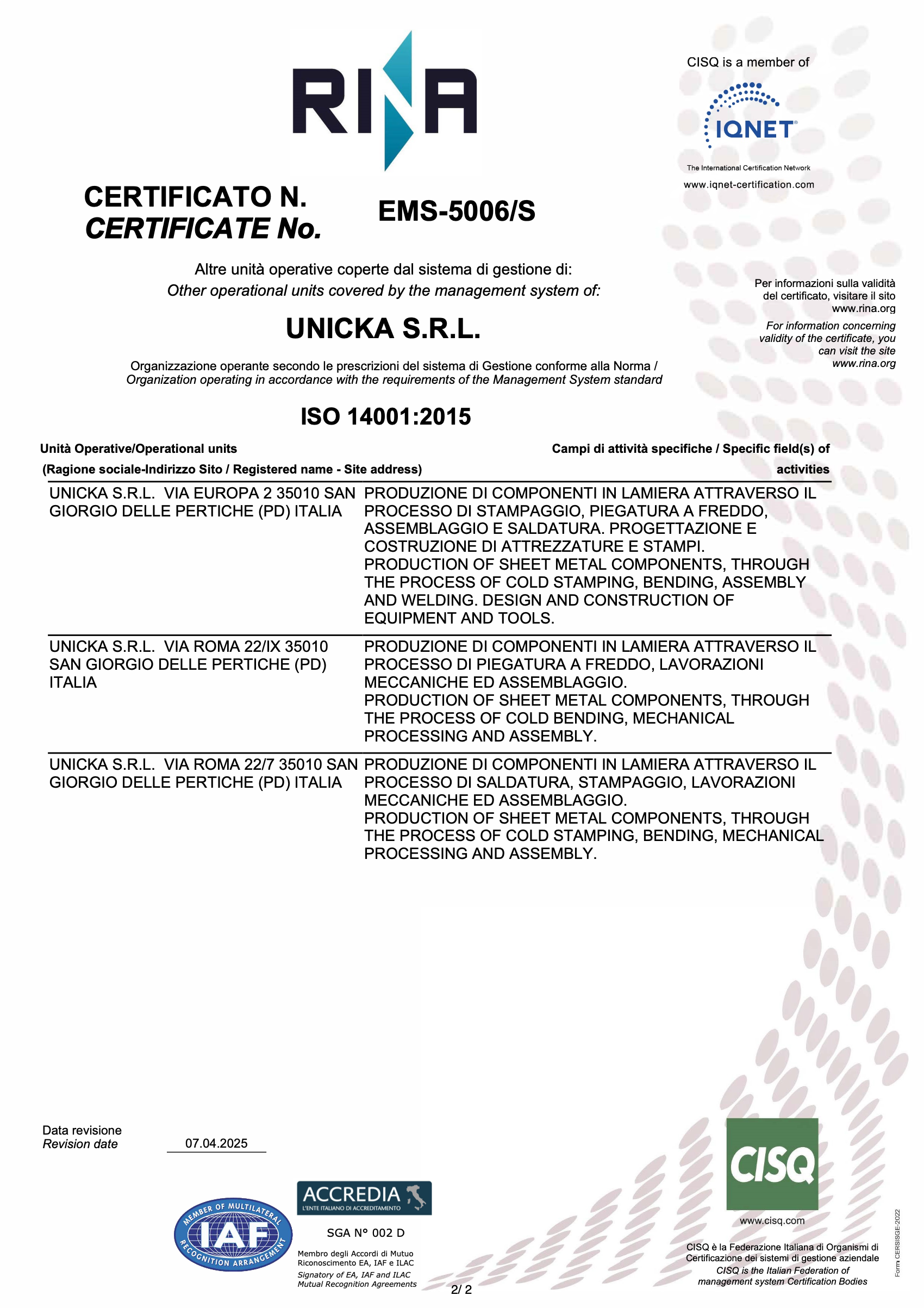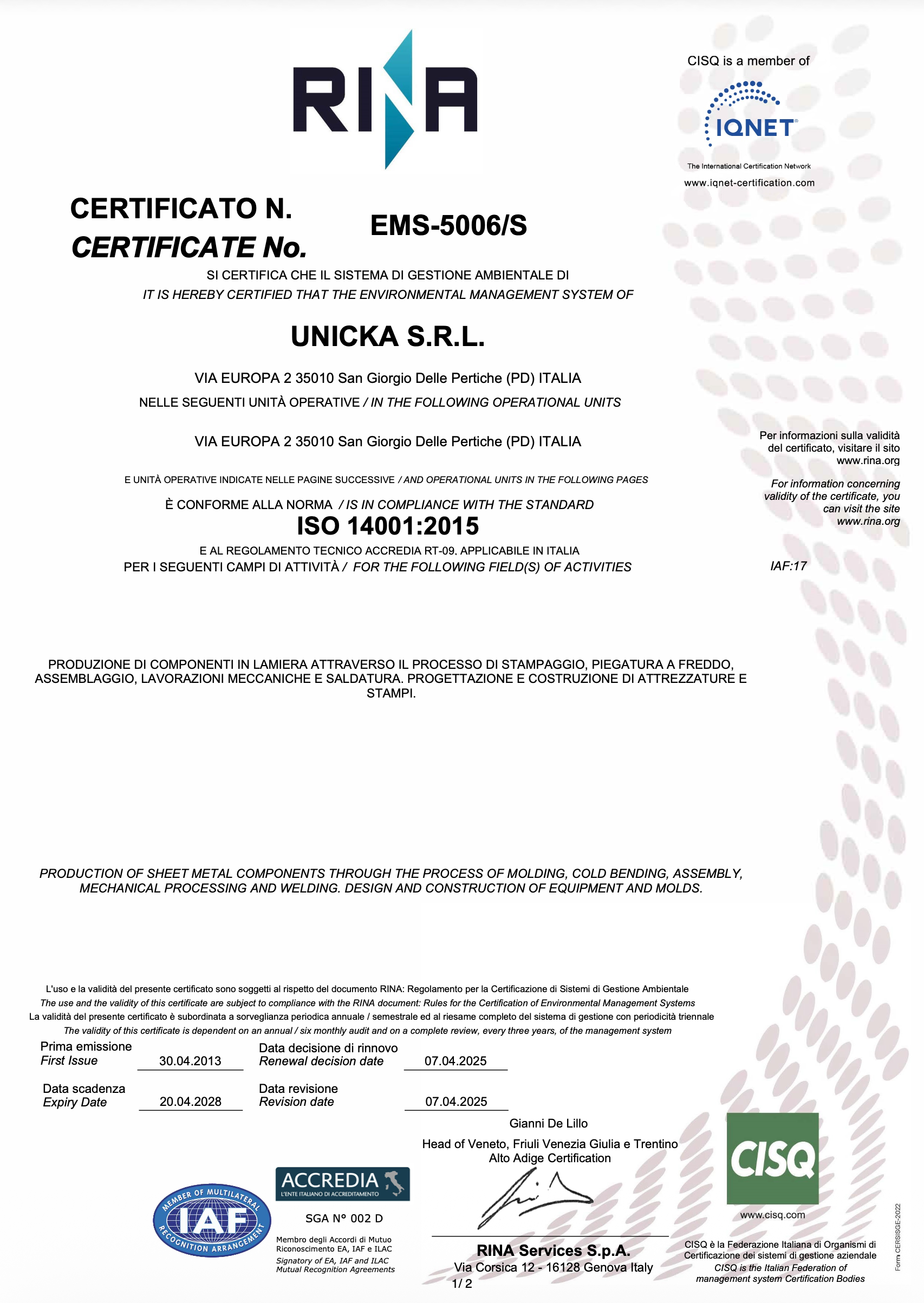 Nel corso degli anni Unicka ha ottenuto importanti certificazioni in materia di qualità, sicurezza e tutela dell’ambiente ad attestare la qualità dei prodotti che escono dagli stabilimenti: