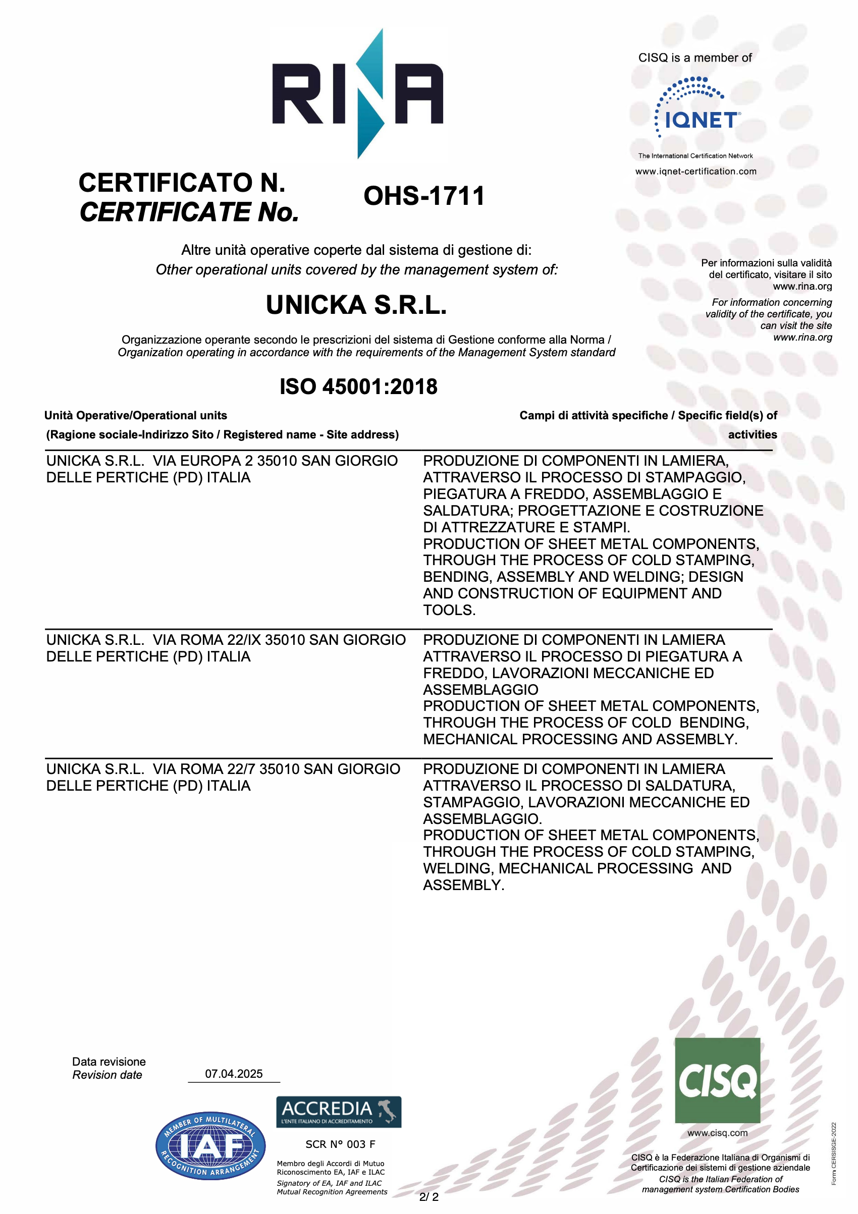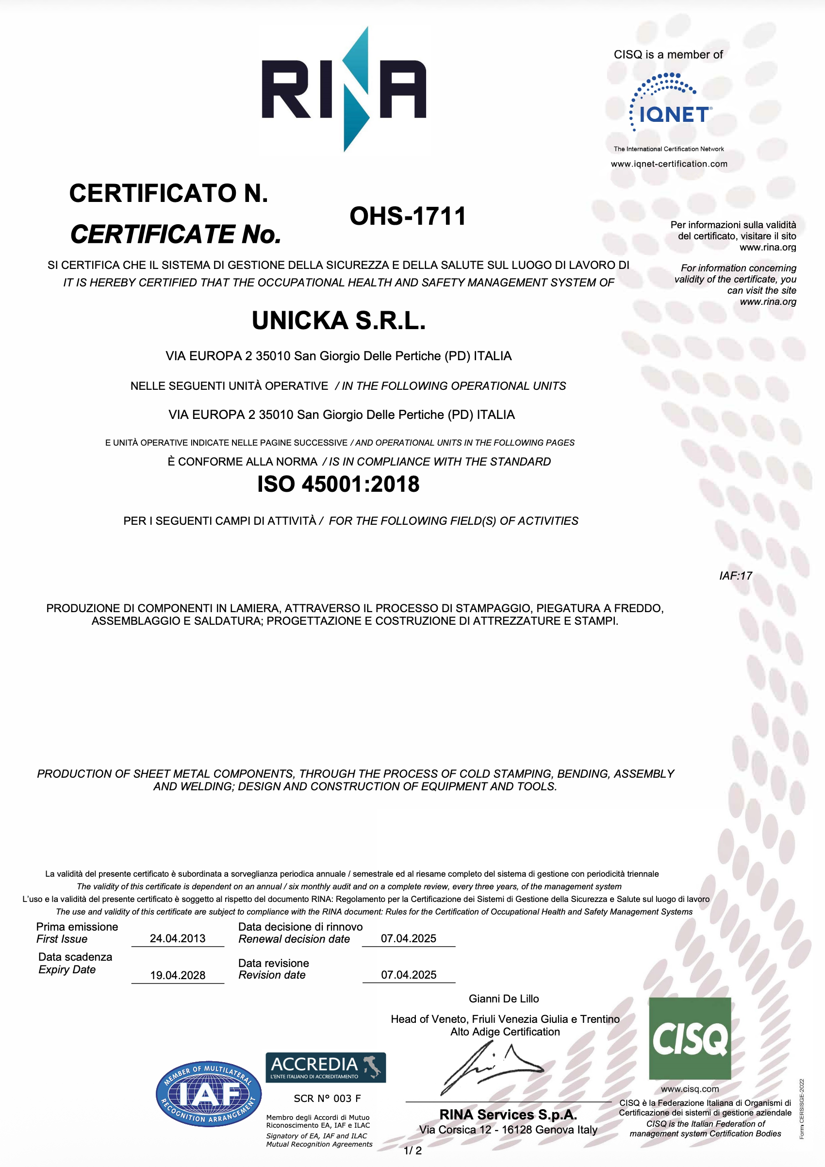 Unicka crede in una politica per la sicurezza, che rispetta l’ambiente di lavoro e tutela i lavoratori. Per questo motivo ha ottenuto importanti certificazioni che attestano la qualità dell’ambiente lavorativo, diffondendo in azienda una condivisa “cultura della sicurezza”.