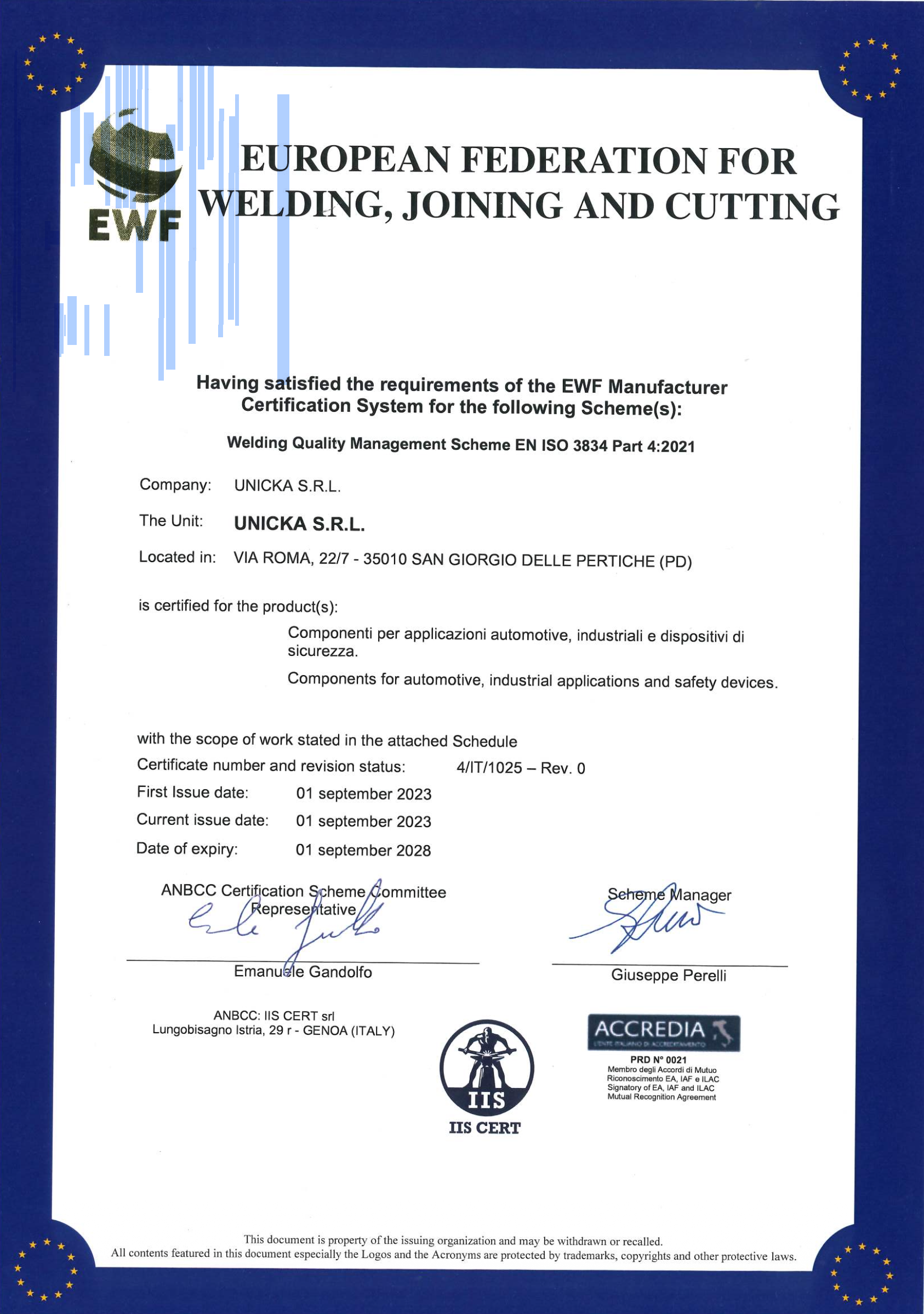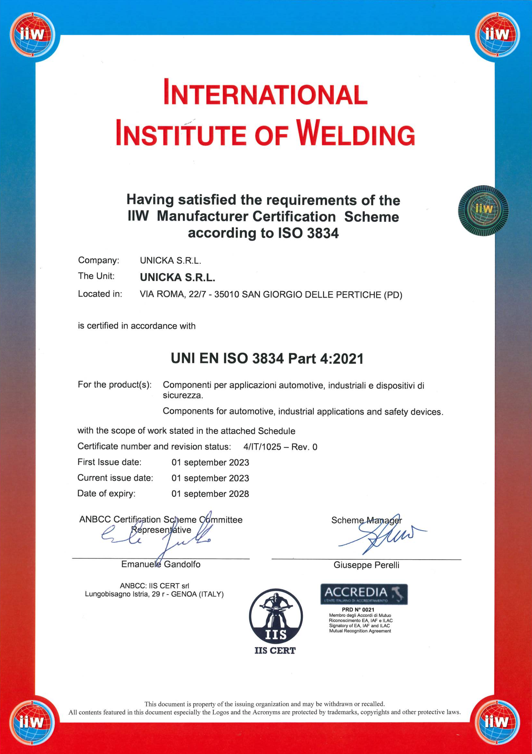- UNI EN ISO 3834 – Certificazione Processi di Fabbricazione mediante saldatura